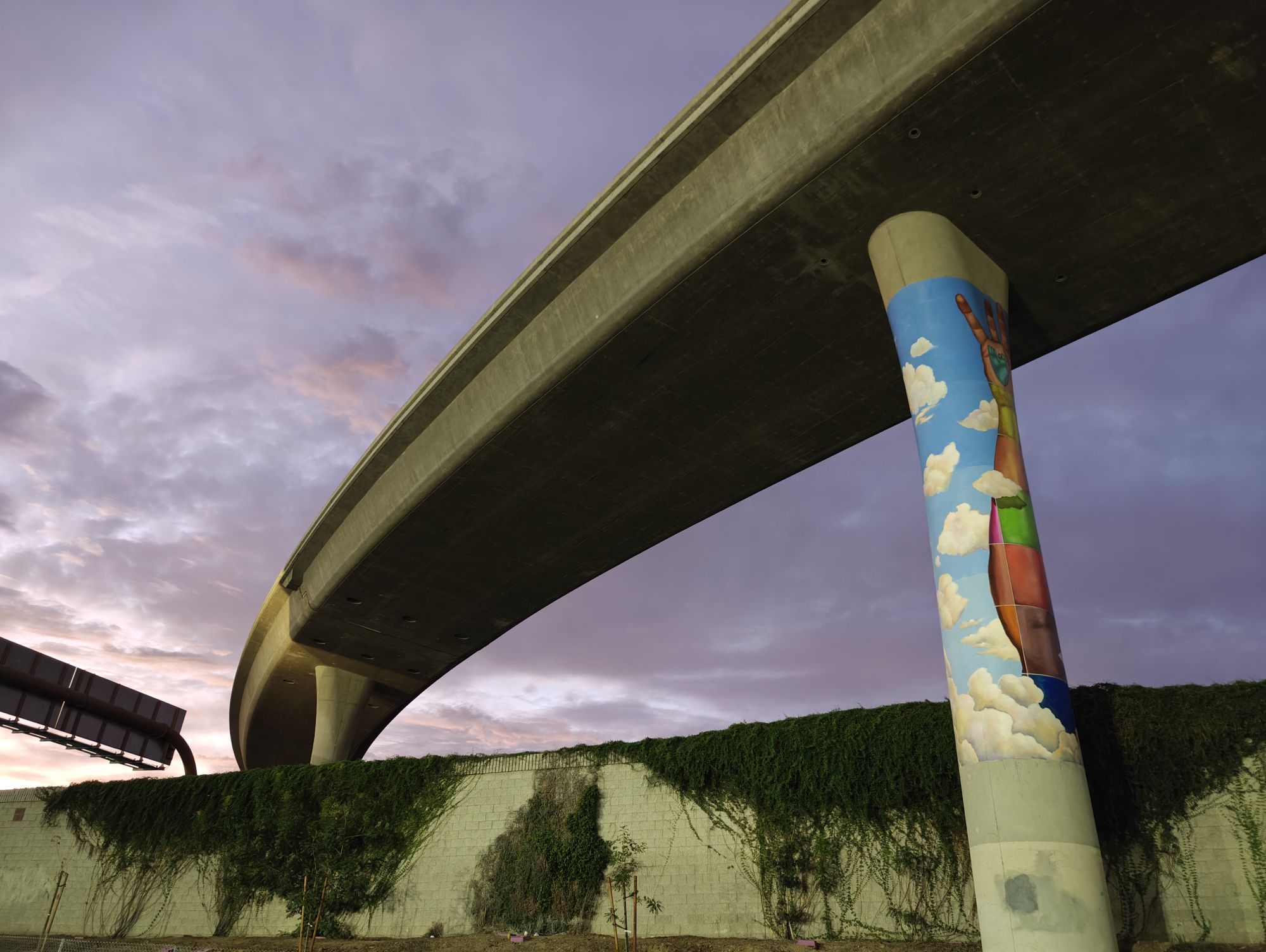 Located along First Street from in between Belmont and Olive, there is a Highway 180 bridge towering above, and as of just a few months ago, I recall seeing a lane closure near this area. The closure was so that painting could commence on the bridge column and its embankment. The artwork seems to be thematically connected with the Romain Neighborhood Center (and Park) nearby, which features a Fresno Mural with the bridge clearly featured.